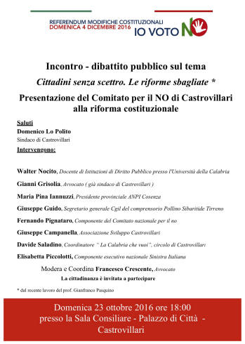 CASTROVILLARI, INCONTRO-DIBATTITO DOMENICA 23 OTTOBRE DEL COMITATO DEL NO AL REFERENDUM |