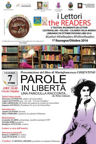 CASTROVILLARI, A " OTTOBRE PIOVONO LIBRI ", INIZIATIVA DELL' ACCADEMIA POLLINEA, VENERDI' 7 OTTOBRE ALLE ORE 18.00, PRESSO IL CIRCOLO CITTADINO PRESENTAZIONE DEL LIBRO DI MARIAFRANCESCA COSENTINO:" PAROLE IN LIBERTA'. UNA FANCIULLA RACCONTA ... " |