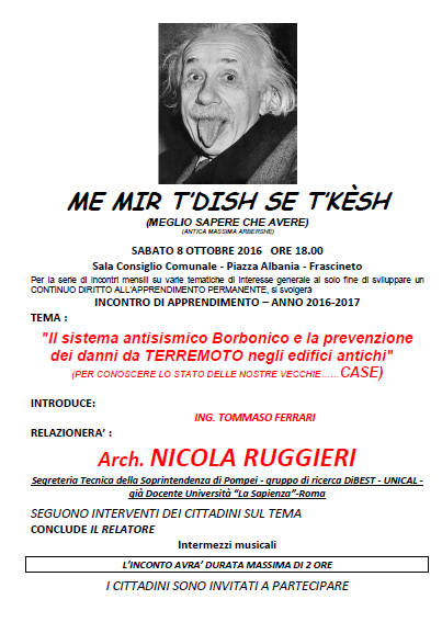 Frascineto - Riprende la serie di appuntamenti: ME MIR T' DISH SE T' KÈSH ( MEGLIO SAPERE CHE AVERE ) ( ANTICA MASSIMA ARBERSHE ) - Il prossimo 6 ottobre a partire dalle ore 18 presso la sala consiliare comunale, continua LA SERIE DI INCONTRI SU VARIE TEMATICHE DI INTERESSE GENERALE AL SOLO FINE DI SVILUPPARE UN CONTINUO DIRITTO ALL' APPRENDIMENTO PERMANENTE. Il tema del prossimo incontro trattera': " Il sistema antisismico borbonico e la prevenzione dei danni da terremoto negli edifici antichi ". I lavori saranno introdotti dall' ing. Tommaso Ferrari, relazionera' l' arch. Nicola Ruggieri, segretario tecnico della Soprintendenza di Pompei-Gruppo di ricerca DiBest - Unical, gia' docente presso " La Sapienza ". L' incontro vivra' anche degli intermezzi musicali e prevede l' intervento dei cittadini. |