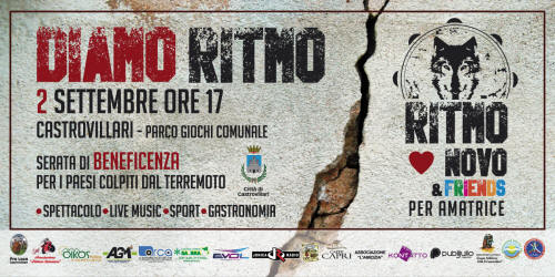 Castrovillari, venerdi' 2 settembre serata solidale per i terremotati al Parco giochi - Nel segno della solidarieta' venerdi' 2 settembre a partire dalle ore 17 al Parco giochi comunale serata di beneficenza per i terremotati, ad allietare il momento il concerto dei Ritmo Novo che insieme a molte associazioni operanti nel territorio del Pollino e con il patrocinio della locale Amministrazione Comunale, vogliono portare solidarieta' alle zone interessate dal devastante sisma che ha colpito il Centro Italia. Il momento sara' arricchito da musica, attrattive per grandi e piccoli, gastronomia e tanto altro ancora, gli introiti provenienti dalle attività svolte durante la serata, verrà devoluto INTERAMENTE alle popolazioni colpite dal sisma. Non mancare, sostieni anche tu la ricostruzione. |