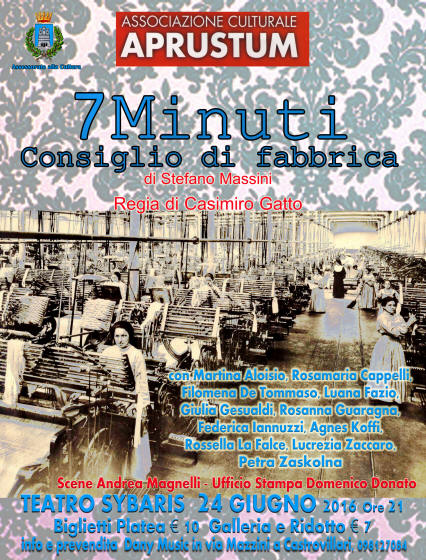 " 7 MINUTI - CONSIGLIO DI FABBRICA " VENERDI' 24 GIUGNO AL TEATRO SYBARIS DI CASTROVILLARI, LO SPETTACOLO INAUGURA LA SECONDA STAGIONE DI: " INVITO AL TEATRO " ORGANIZZATO DA APRUSTUM |