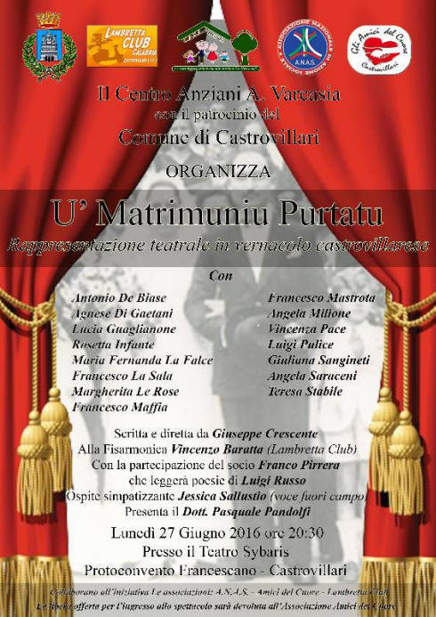 Castrovillari, " U' matrimuniu purtatu " in scena al Sybaris lunedi' 27 giugno. Organizzata dal Centro anziani " A. Varcasia " con il patrocinio del comune di Castrovillari va in scena lunedi' 27 giugno alle ore 20,30 al teatro Sybaris la rappresentazione teatrale in vernacolo castrovillarese: " U' matrimuniu purtatu ", scritta e diretta da Giuseppe Crescente. La libera offerta per assistere allo spettacolo verra' devoluta all' associazione: " Amici del cuore ". Una serata all'insegna delle tradizioni letterarie in vernacolo del capoluogo del Pollino. Nel corso dello spettacolo verranno inoltre lette da Franco Pirrera alcune poesie di Luigi Russo. Alla manifestazione partecipano a vario titolo anche le associazioni: Lambretta club, Anas e Amici del cuore. La rappresentazione vivra’ una fase introduttiva a cura di Pasquale Pandolfi, le musiche saranno di Vincenzo Baratta alla fisarmonica e, anche in qualita' di ospite simpatizzante, Jessica Sallustio sara’ la voce fuori campo. Recitano: Antonio De Biase, Agnese Di Gaetani, Lucia Guaglianone, Rosetta Infante, Maria Fernanda La Falce, Francesco La Sala, Margherita Le Rose, Francesco Maffia, Francesco Mastrota, Angela Milione, Vincenza Pace, Luigi Pulici, Giuliana Sangineti, Angela Saraceni e Teresa Stabile. |