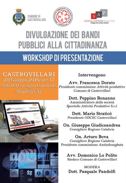 CASTROVILLARI, MARTEDI' 28 GIUGNO, WORKSHOP SUI BANDI PUBBLICI. L' APPUNTAMENTO E' PER LE ORE 17 NELLA SALA CONSILIARE |