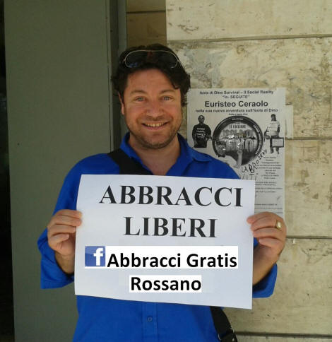 DALL’ AUSTRALIA A ROSSANO DOMENICA 22 MAGGIO FREE HUGS, " ABBRACCI GRATIS ", L' INVITO ALLA PRIMA EDIZIONE E' DI EURISTEO CERAOLO CHE DICHIARA: " SARA' FORTEMENTE CONTAGIOSO E TRAVOLGENTE COME UNO TSUNAMI " - 1° Abbracci Gratis regionale a Rossano - L' invito all' abbraccio gratuito e' di Euristeo Ceraolo che dichiara: " Sara' fortemente contagioso e travolgente come uno Tsunami ". Appuntamento in Piazza B. Le Fosse (zona Garitta vigili) domenica 22/05/2016 ore 18.30/20.00 per la prima iniziativa sociale a Rossano del “Free Hugs”. L'idea è molto semplice quella per esempio di camminare per le strade del centro storico o incontrarsi in piazza, in strada, al mare, al centro commerciale o in un qualsiasi luogo pubblico e fermarsi per qualche momento in un punto, aprendo le braccia e invitando i passanti per un semplice abbraccio. L'idea è quella di provare ad abbracciare e di essere abbracciato. Abbracciare ed essere abbracciati……!!! Mi piacerebbe considerarlo un modo “gratuito” per accorciare le distanze tra tutti noi; quando abbracci uno sconosciuto non gli chiedi prima come si chiama, da dove viene, chi è, a chi appartiene, a quale colore politico, razza o etnia, non ti interessa la sua religione, sesso, o altro ma abbracci e basta, chiunque esso sia. E' quindi forse il modo più bello, onesto e sincero per ritornare ad essere umani. Il Movimento degli abbracci gratis nasce a Sidney (Australia) e risale a circa dieci anni fa. Fu Juan Mann a lanciare il primo esperimento dei Free Hugs, tra il 2004 e il 2006, per poi diffondersi in molte altre città del mondo, consiste nel Donare Abbracci Gratis ai passanti nei luoghi pubblici, la cui idea è semplicemente quello di offrire un atto casuale di gentilezza disinteressata ed è quello che faremo in piazza con tutto il gruppo dei partecipanti. Con un abbraccio, si può riempire in un solo attimo l'anima, anche in un momento di sofferenza si può lasciare un grande segno. Lo scopo degli abbracci gratis è offrire un atto casuale di gentilezza disinteressata, abbattere il muro di indifferenza che separa le persone. Per aderire alla giornata è molto semplice. Basta invitare un po’ di amici prendere un cartello e scriverci sopra “Mi abbracci? "Dono Abbracci", "Abbracci Liberi", "Regalo Abbracci", "Abbracciamoci" “Free Hugs” anche nella propria lingua di provenienza. Oppure semplicemente “Abbracci Gratis” e scendere tra la gente. Se l'idea ti piace, iscriviti e partecipa anche tu al gruppo facebook: Abbracci Gratis Rossano - Calabria Free hugs - PER INFO: https://www.facebook.com/groups/AbbracciGratisRossano/ Sicuri del successo dell’ iniziativa...vi aspettiamo numerosi! Un Abbraccio Gruppo Free Hugs Rossano (Jonio-Pollino) Ceraolo Euristeo |