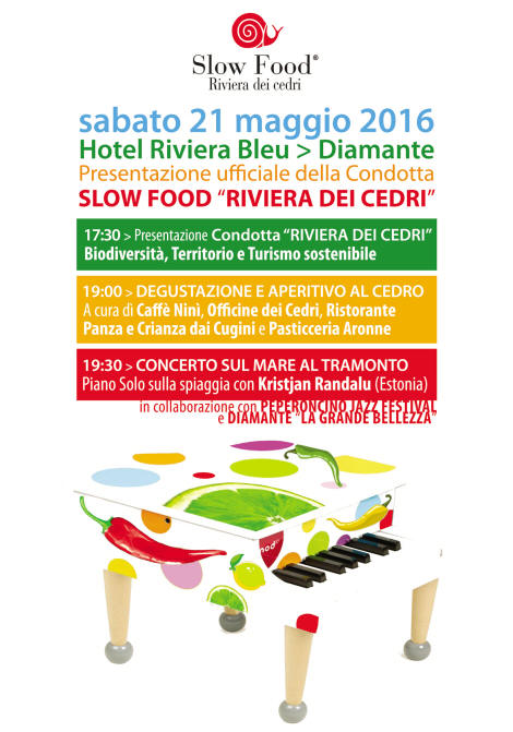 DIAMANTE, DOMANI DALLE ORE 17:30 PRESENTAZIONE DELLA NUOVA CONDOTTA SLOW FOOD " RIVIERA DEI CEDRI " PER L' OCCASIONE UN ANTEPRIMA DEL " PEPERONCINO JAZZ FESTIVAL " CON IL CONCERTO DEL PIANISTA ESTONE KRISTJAN RANDALU |