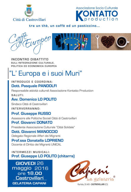 CASTROVILLARI, GIOVEDI' 26 MAGGIO INCONTRO-DIBATTITO: " L' EUROPA E I SUOI MURI ", SU INIZIATIVA DELL' ASSOCIAZIONE KONTATTO PRODUCTION |