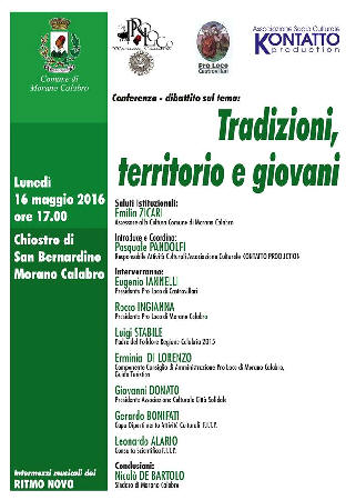 MORANO CALABRO, LUNEDI' 16 MAGGIO CONFERENZA DIBATTITO SUL TEMA: TRADIZIONI, TERRITORIO E GIOVANI |