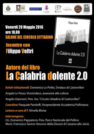 CASTROVILLARI/LIBRI. VENERDI' 20 MAGGIO , AL CIRCOLO CITTADINO, L?INCONTRO CON IL GIORNALISTA SCRITTORE FILIPPO VELTRI PER LA PRESENTAZIONE DEL SUO NUOVO LIBRO " LA CALABRIA DOLENTE 2.0 " |