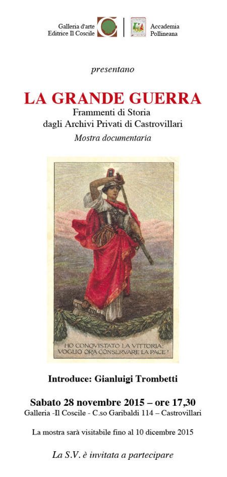 LA GRANDE GUERRA. FRAMMENTI DI STORIA DAGLI ARCHIVI PRIVATI DI CASTROVILLARI. INAUGURAZIONE IL 28 NOVEMBRE PRESSO LA GALLERIA D' ARTE " IL COSCILE " - MOSTRA DOCUMENTARIA A CURA DI GIANLUIGI TROMBETTI |