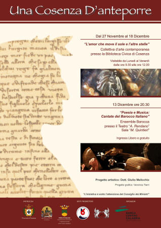 " Una Cosenza D'anteporre ", omaggio a Dante Alighieri. L' iniziativa dal 27 novembre al 18 dicembre 2015 presso la Biblioteca Civica - Arte, poesia e musica per una Cosenza D' anteporre che celebra il 750mo anniversario della nascita di Dante Alighieri. L' associazione culturale " Cosenza Autentica " che opera per la tutela, la valorizzazione e la promozione del territorio, promuove nella splendida cornice della Biblioteca Civica di Cosenza un ricco e variegato contenitore di eventi culturali denominato "Una Cosenza D'anteporre", progetto artistico del dott. Giulio Melicchio al fine di ricordare i “750 anni dalla nascita del sommo poeta fiorentino e dei suoi versi immortali, coadiuvato da Veronica Tierri per la pregevole realizzazione grafica. L’iniziativa, dal 27 novembre al 18 dicembre 2015, è promossa in collaborazione con l'associazione culturale “Mystica Calabria”, ideatrice della mostra ed è patrocinata dagli enti pubblici territoriali quali la Provincia di Cosenza, il Comune – Assessorato alla Comunicazione e Marketing territoriale e la Biblioteca Civica di Cosenza, oltre ad essere sotto l’attenzione del Consiglio dei Ministri. Presso la prestigiosa biblioteca verrà allestita la collettiva d’arte contemporanea di ben 21 opere di artisti calabresi che si sono ispirati alle cantiche della Divina Commedia, dal suggestivo titolo dantesco “L’amor che move il sole e l’altre stelle”. L'esposizione, curata dalla prof.ssa Ines Ferrante con la consulenza critico-letteraria della prof.ssa Milena Filomia, sarà visitabile da lunedì a venerdì dalle ore 09.30 alle ore 12.00. Domenica 13 dicembre alle ore 20.30 presso il Teatro “A. Rendano” – sala “M. Quintieri” - l’ensemble barocca dell’ente “Cosenza Autentica” proporrà il concerto “Poesia e Musica: cantate del barocco italiano”; l’ingresso sarà libero e gratuito. |