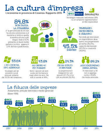 Provincia/Economia. Il rapporto annuale sull' economia locale realizzato dall' Istituto Demoskopika per conto della BCC Mediocrati. La maggior parte degli imprenditori possiede un livello di istruzione medio-alto. Ben 9 soggetti attivi su 10 non fanno parte di alcuna rete di impresa. Significativa la fetta dei giovani capi d' azienda che alimenta il proprio know-how. Ancora poco significativo l' impiego del world wide web e degli strumenti social per fare impresa. E' quanto emerge dal consueto rapporto annuale BCC Mediocrati - Demoskopika sull' andamento dell’economia locale. Giovane, preferibilmente laureato, con una buona conoscenza del settore di attività, predisposto al rischio, decisionista, creativo e consapevole dell’importanza della formazione sua e del personale per “stare” sul mercato. è questo l’identikit dell’imprenditore che comincia a segnare il passo del mercato economico locale per uscire dalla crisi, che cerca di fare breccia su un’offerta imprenditoriale attualmente ancorata a strategie tradizionali e poco predisposta ad aggregarsi: scarsa conoscenza delle lingue, insignificanti investimenti in ricerca e sviluppo, poca voglia di innovare e di fare rete, utilizzo ancora insufficiente di internet e dei canali social per penetrare nuovi mercati. Sul versante del clima di fiducia, migliora il sentiment degli imprenditori per il prossimo anno. è il quadro che emerge dal consueto rapporto annuale sull’economia locale realizzato dall’Istituto Demoskopika per conto della Banca di Credito Cooperativo Mediocrati. «Molte indagini sul fenomeno imprenditoriale – dichiara il presidente della Banca di Credito Cooperativo Mediocrati, Nicola Paldino - hanno evidenziato come il livello di istruzione e formazione degli imprenditori rappresenti una variabile rilevante, con effetti significativi sui risultati conseguiti dalle imprese stesse in termini di probabilità di sopravvivenza, crescita del fatturato, dell’occupazione, profittabilità, propensione all’innovazione e valorizzazione del capitale umano. Ciò ovviamente – precisa Nicola Paldino - non significa che per essere oggi un buon imprenditore sia necessario avere una laurea o un diploma, ma che, a parità di esperienza un imprenditore laureato o diplomato raggiunge migliori risultati di uno con un basso livello di istruzione. In questo scenario l’innalzamento del livello della formazione di tipo formale di chi fa impresa è dunque di per sé un obiettivo auspicabile. Ancora più importante è che a ciò si aggiunga una maggiore attenzione per la formazione imprenditoriale, a tutti i livelli di istruzione, - conclude Nicola Paldino - al fine di potenziare sia le attitudini che le competenze legate all’imprenditorialità». «L’importanza di puntare su un capitale umano di livello, - commenta il direttore dell’Istituto Demoskopika, Nino Floro - muove dalla consapevolezza che un bagaglio di conoscenze inadeguato produce effetti distorsivi, intrappolando in un circuito vizioso i soggetti le cui decisioni hanno un peso elevato nel governare e orientare i processi di allocazione delle risorse aziendali. I potenziali effetti distorsivi e il costo di decisioni inadeguate aumentano, infatti, con la quantità di risorse governate dal decisore. Ridotti livelli di qualificazione di chi ha responsabilità di governo dell’impresa – conclude Nino Floro - si traducono, inevitabilmente, in un basso profilo della domanda di capitale umano e di conoscenza, che a sua volta genera ridotti rendimenti dell’istruzione e, quindi, minori incentivi ad investire nello stesso capitale umano». La top three di chi imprende: temerario, decisionista e creativo. Per comprendere le principali caratteristiche presenti negli imprenditori locali, agli intervistati è stato chiesto di individuare quale tratto personale dovrebbe possedere, a loro giudizio, un imprenditore tra una lista di 10 personal traits ritenuti più comuni dagli studiosi. In testa con lo stesso grado di importanza gli imprenditori indicano la propensione al rischio con il 45,5%, e la capacità decisionale 43,3%, seguiti non molto distante dalla creatività, qualità questa indicata da oltre un terzo del campione, il 36,6%. L’indicazione della creatività come uno dei principali tratti personali è significativa, considerando che gli intervistati operano in settori tradizionali e che essa è solitamente riconosciuta una tipica caratteristica degli imprenditori italiani che consente di bilanciare, almeno in parte, altre carenze comportamentali degli imprenditori. Meno significative le indicazioni riguardanti la predisposizione al cambiamento (29,8%) e i rapporti umani (28,9%) e l’autodeterminazione (27,5%). Competenze: conoscenza del settore prioritaria per il 79,5% degli imprenditori. Ben 8 soggetti intervistati su 10 scelgono la profonda conoscenza del settore in cui operano quale competenza prioritaria da possedere. Tale risultato si può definire come aderente alle attese poiché, gli imprenditori locali, operano principalmente in settori tradizionali e in mercati poco dinamici; di contro sembrano avere meno competenze manageriali (23,6%), di marketing (16,2%) o ancora attitudini nel lavorare in team (19,7%), conoscenze tecniche e tecnologiche (15,6%) e di misurazione del rischio (15%). Infine, i soggetti intervistati dichiarano di essere ancora meno preparati nel campo dell’information technology (6,4%), e in materia di finanza (9,1%) oltre che non possedere grandi capacità analitiche (8%) e attitudini nella risoluzione dei conflitti (9,3%). Istruzione: prevalgono i “capi d’azienda” con un livello medio-alto. Oltre l’80% degli imprenditori cosentini presenta un livello di istruzione medio-alto, di questi la maggioranza, il 52,9%, ha conseguito un diploma di scuola media superiore e il 28,7% possiede un titolo universitario, (laurea breve 4,5%, laurea magistrale 23,1%, specializzazione post laurea, dottorato, master 1,3%), gli imprendito