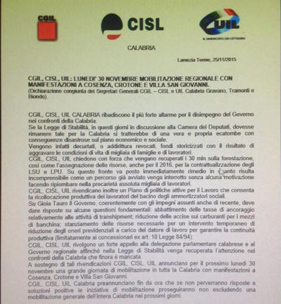 Confermato lo sciopero generale indetto dai segretari regionali di CGIL, CISL e UIL per il 30 novembre, intanto gia' da domani l' USB manifesta all' aeroporto di Lamezia - Sindacati sul piede di guerra contro il disimpegno del Governo nei confronti della Calabria. " La legge di stabilita' in discussione alla Camera dei deputati se dovesse rimanere tale sarebbe una ecatombe per la Calabria ", questo il messaggio lanciato dalle segreterie regionali di CGIL, CISL e UIL che indicono per il 30 novembre uno sciopero generale regionale. Un disastro economico-sociale insistono i sindacati confederali a causa della decurtazione di fondi definiti " storicizzati ", nella nota inviata si parla di trenta milioni di euro per i forestali e della mancata assegnazione delle risorse per il 2016 destinate alla contrattualizzazione degli LSU-LPU. Non i soli provvedimenti che per forza di cose andranno a minare una situazione gia' di per se' difficile. Relativamente ai lavoratori socialmente utili, e' frenetica l' attivita' per scongiurarne la fine. In questi giorni una lettera congiunta dei parlamentari calabresi in merito e' stata inviata alla presidenza del Consiglio dei Ministri e, sempre in questi giorni una delegazione trattante con in testa il Presidente della regione Calabria ha avuto un incontro presso il ministero competente, in questa sede e' emersa la volonta' di non rifinanziare i progetti LSU/LPU con le conseguenze relative vista l' attuale competenza degli stessi, in merito l' assessore regionale Roccisano si e' appellata ai sindaci affinche' affianchino i lavoratori a rischio. Come si diceva non i soli tentativi di disimpegno del Governo, servono risposte sul porto di Gioia Tauro e su una viabilita' sempre piu' a limite e soprattutto decidere cosa si vuole fare di questa regione: petrolio e/o turismo. In conclusione nella nota inviata i sindacati rivolgono un forte appello alla delegazione parlamentare calabrese, affinche' si recuperi l' attenzione per la Calabria. Lunedi' 30 novembre sono previste manifestazioni a Cosenza, Crotone e Villa San Giovanni. Il sindacato USB ha fatto sapere che sabato manifestera' presso l' aeroporto di Lamezia. |